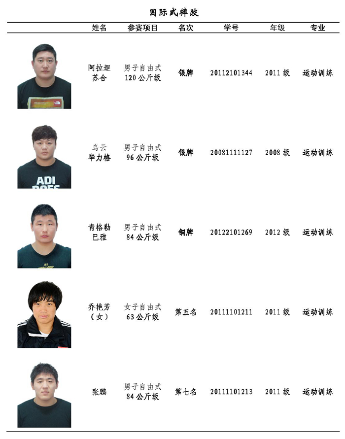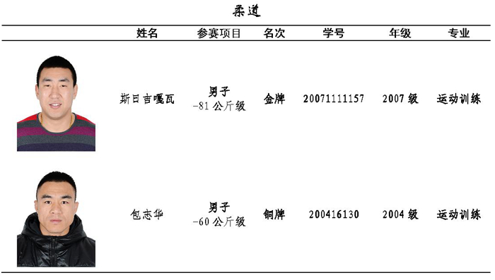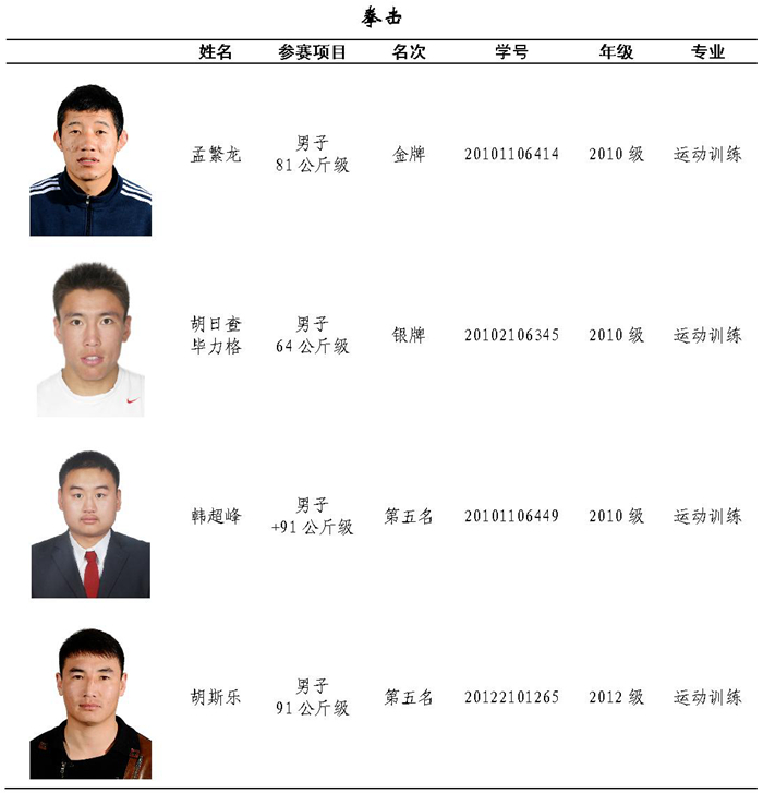 内蒙古自治区代表团共派出213名运动员参加19个大项、138个小项的比赛。其中我校高水平运动员近45人参加了柔道、拳击、摔跤和田径4个大项的比赛,经过紧张激烈的角逐,最终获得2枚金牌、3枚银牌、3枚铜牌、3项第五名和1项第七名的优异成绩。